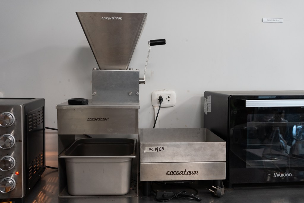 For speciality cacao Norandino even carries out tests that involve making small batch samples of chocolate. The photo below shows a mini-oven for roasting and a grinder. Winnowing is done using a classic hoover setup. The final step of course is conching the nibs to make the chocolate.