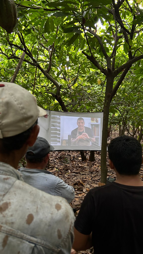 Our only challenge was finding a place outdoors that was dark enough at 5pm. The bane of cacao farmers are mosquitos, which love to come out at night. Our trouble was that the projector wouldn’t be strong enough in daylight.