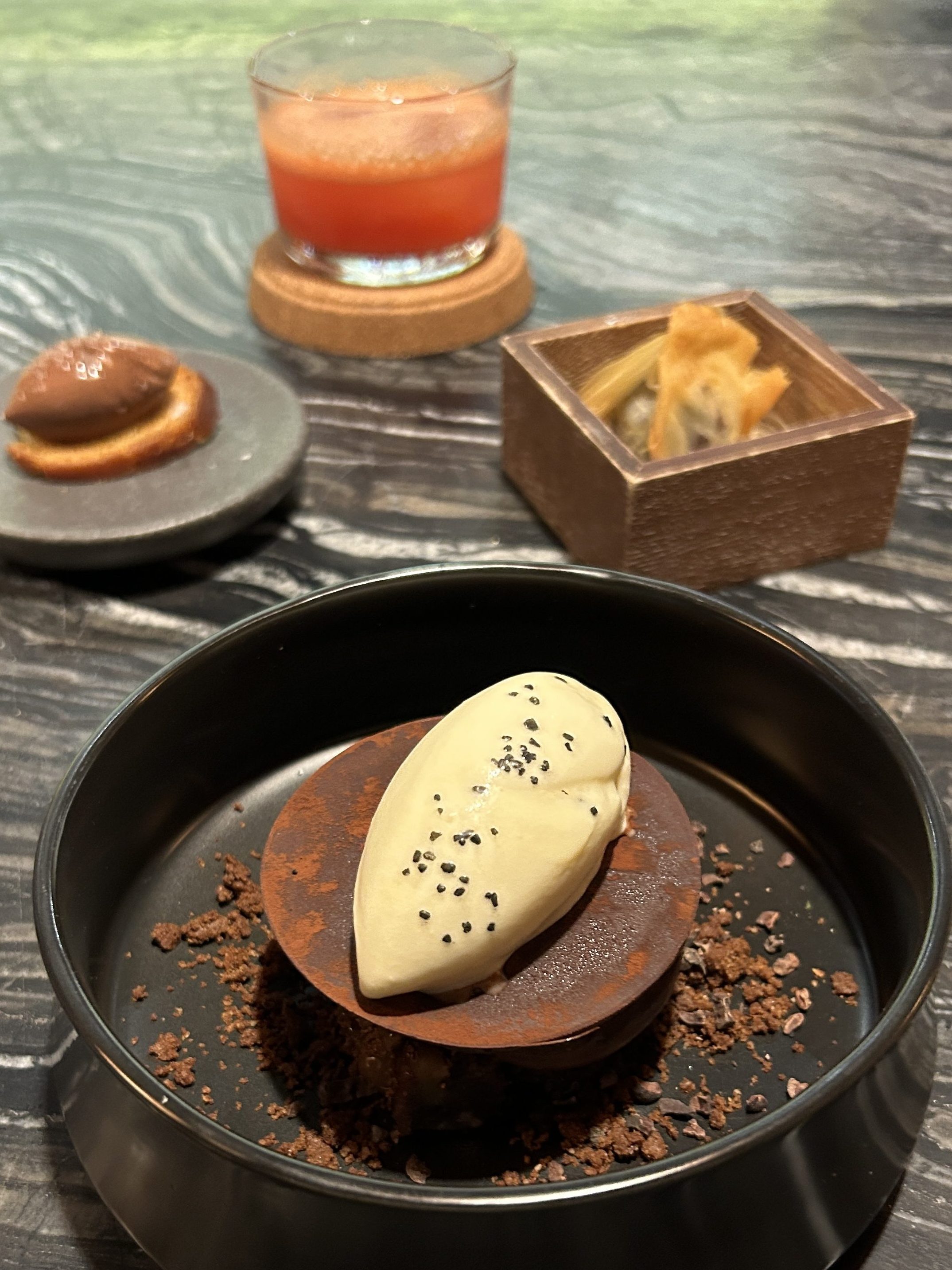 Number three in the trilogy required more time to assemble and comprises a chocolate cake, chocolate disc, nibs, caramel and ice cream. It’s refreshing, has crunch and chocolate written all over it. Divine!
