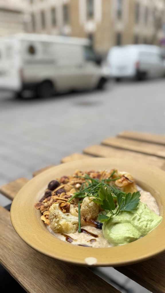 The porridge was a salty base of oats with roasted cauliflower, tahini and crunchy granola.