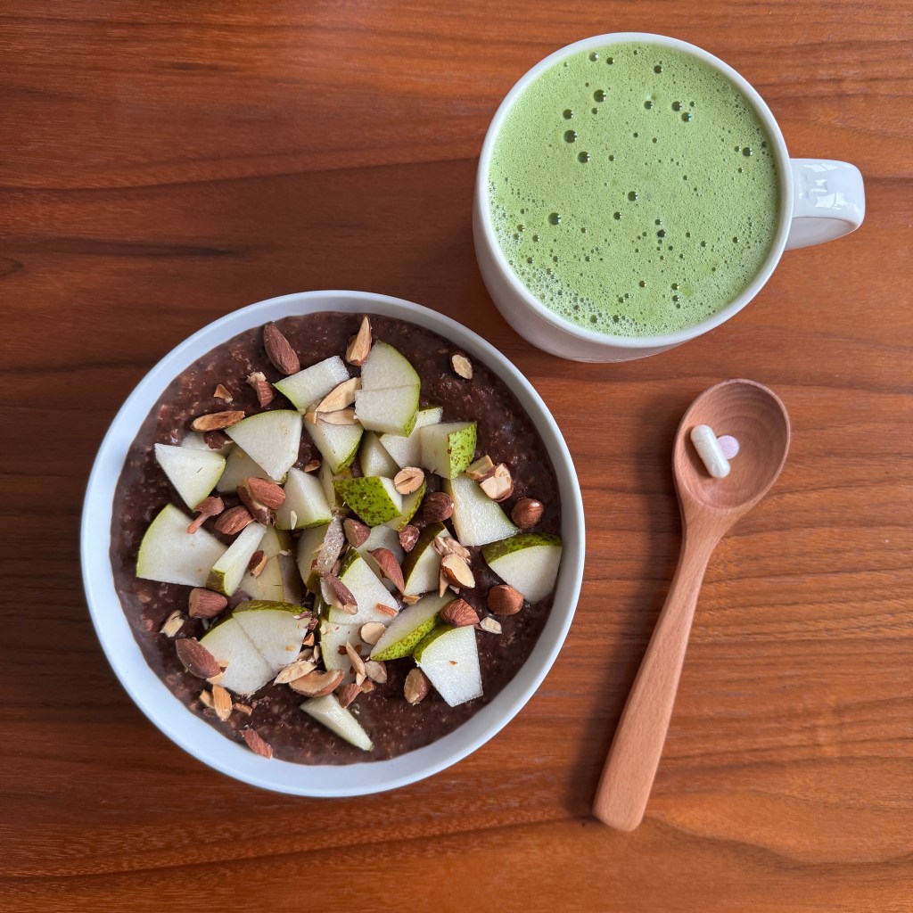 One thing I can’t get enough of is chocolate porridge for breakfast. If you want the recipe let me know! (FYI, those are my daily drugs for all the vitamins you lack when living in London for an extended period of time.)