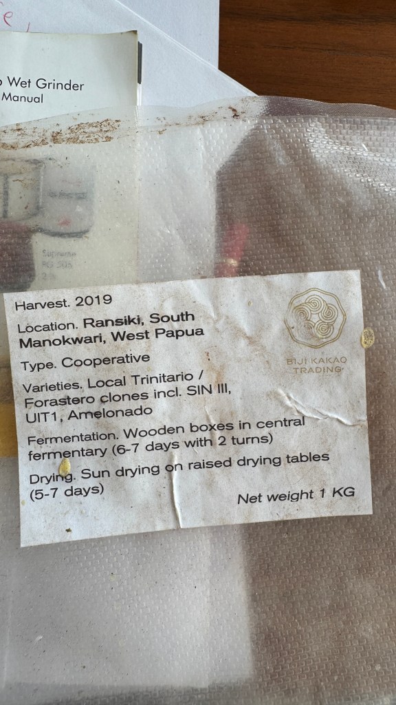 At the end of February, I made my very first chocolate bar with beans from West Papua. A big ‘Thank You’ goes out to Phil Landers for helping me get started. I made a 70% bar and it’s pretty darn good for a first one. Ask my family. It’s all gone!