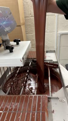 The chocolate in there was salted Virunga from the Congo. It’s used for batons in pain au chocolat and one of their standing orders for bakeries. In order to get an even amount into the moulds we attached a device, which looked like a shower head. I had a go as well, which was fun!