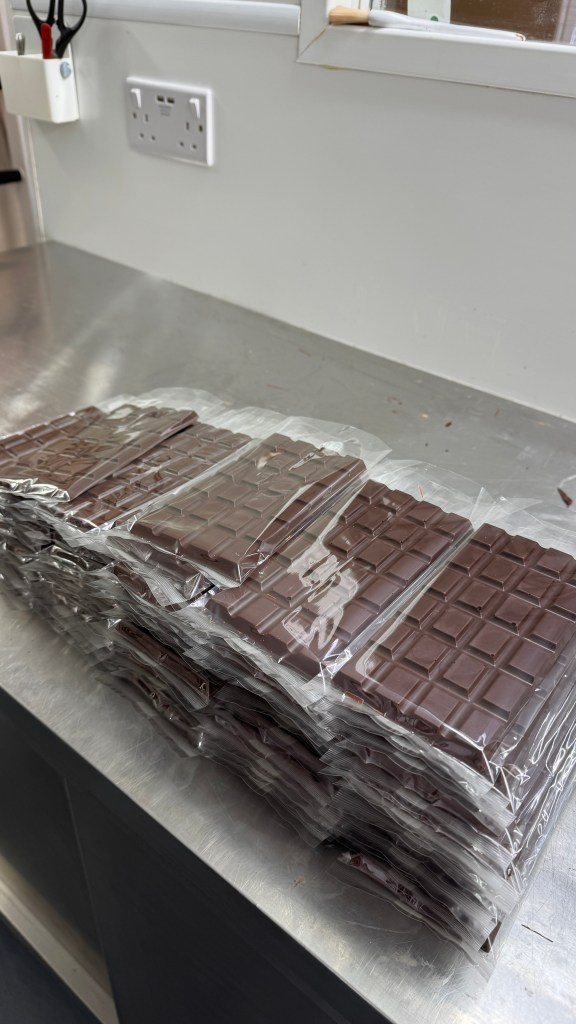 Our final task for the day was piping the chocolate into the moulds. Then I sealed them after delicately sliding them into their compostable wrappers. When it came to this part my cold hands were finally useful for once.